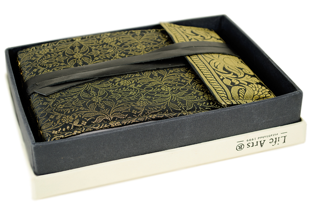 • The Sari Black Photo Album is handmade in India using traditional sari silk as the primary material combined with a genuine leather strap to create